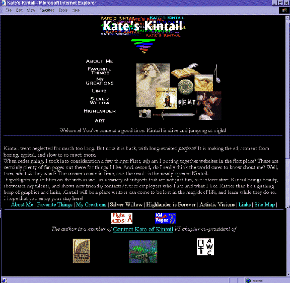 Kate’s Kintail, my personal website, began four years ago as a page about Celtic and Scottish culture, writing, fantasy, and a few other things. It was named for the small Scottish village where I set my novels. Over the years, it changed and evolved as I learned more HTML and JavaScript, and last summer it became the website you see now full of information about me and the many things I love. Topics range from Scotland to musicals to Renaissance art to musical groups. I have many of my writings and web creations there, as well as quotes, photography, and even my résumé.