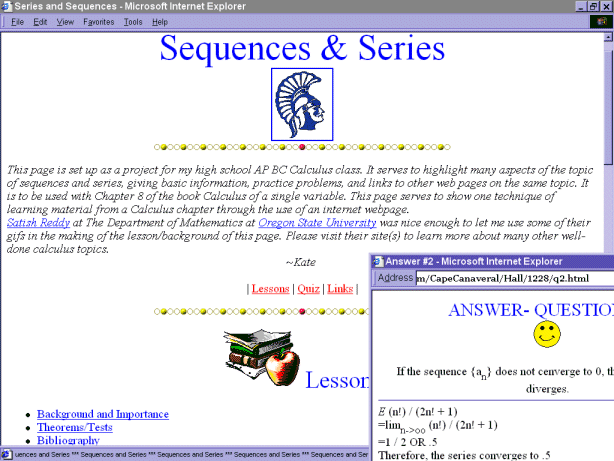 In hopes of giving us a broad education, my high school AP BC Calculus teacher required us to do a research paper on a recent calculus topic. Instead of writing a ten page paper, I asked to put together a website. She loved the idea, and I had a wonderful time putting together an informative and useful site about sequences and series. The site, still up and running, has background explaining what they were used for; it had lists of all the related equations and theorems; and it also had sample problems and full answers with links to related proof.