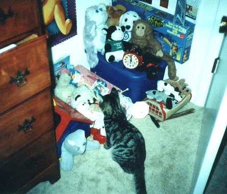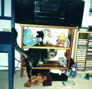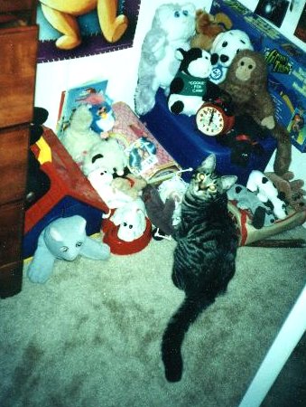 His favorite toy is of course his little gray mousey which has been known to turn up in the corner of the bathroom. However, he did have quite an adventure one day when he jumped into the 'childhood' corner of my room and woke up my sleeping Furby. It woke, blinking and talking, and Max jumped back. He sat watching it for almost 10 minutes, creeping up, jumping back. Turning to me with a 'What is that, Mommy?' expression