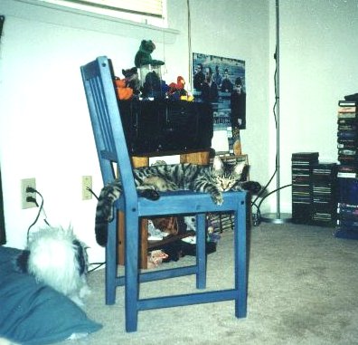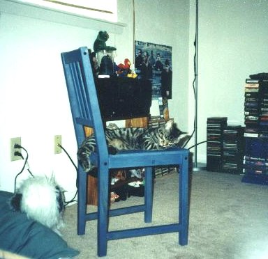 Oddly enough, he really enjoys sleeping on the chair. Perhaps he's higher up? Whatever the reason, he really likes it and he looks so cute doing it!